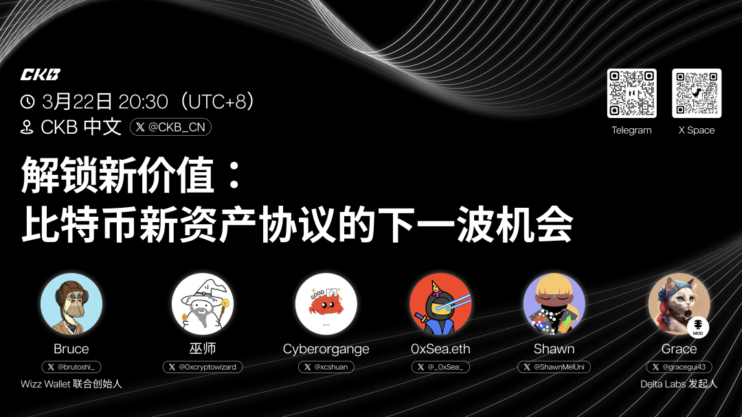CKB CN invites Wizz Wallet co-founder Brutoshi, crypto KOLs Wizard, OxSea.eth, Shawn, community ambassador Cyberorange, and DeltaLabs founder Grace to discuss the next wave of opportunities for Bitcoin new asset protocols.